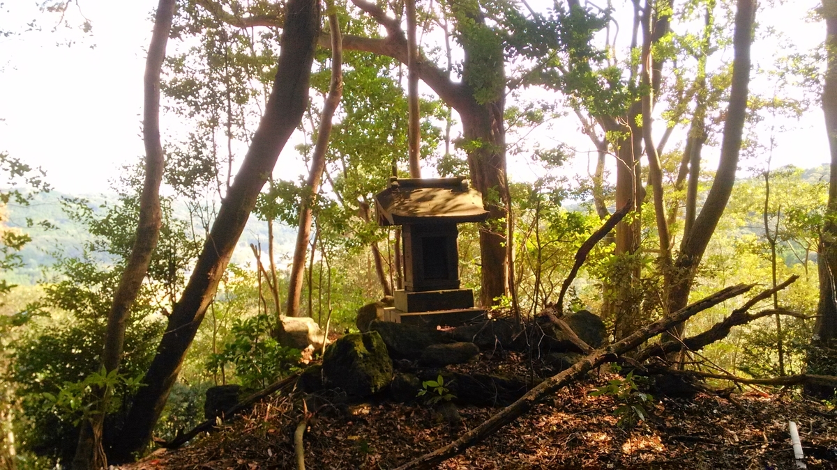 奥づめには5基の石祠が並んでいました。左右に傾きがちで、石燈籠も壊れてしまい、やや荒れ気味の印象を受けます。林道が開通したとはいえ、この山中にあってはお参りが少ないのでしょう。山の上から麓の村々を守ってくださっている、ありがたい神様です。お参りをして、自然災害の予防をお願いいたしました。