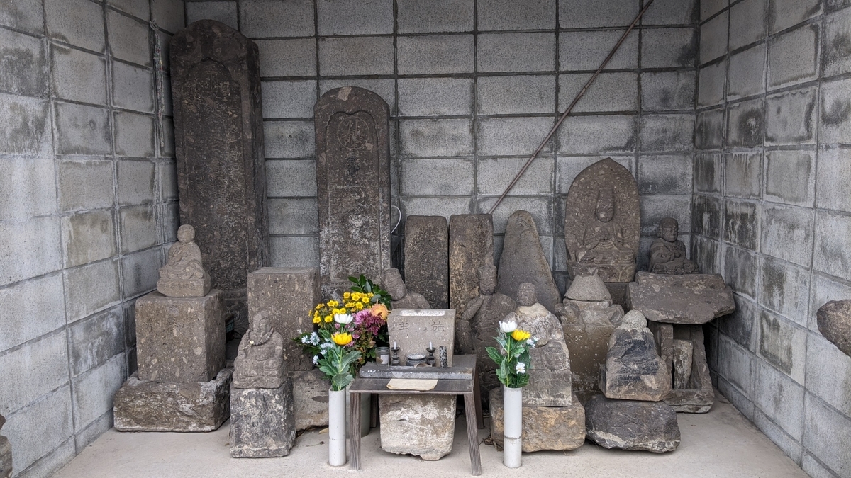 国道210号「ななせ大橋東」交叉点から県道41号を進みますと、道路右側にコンクリートブロックでこしらえた簡易的な覆い屋の中にたくさんの石造物が寄せられています(冒頭の写真)。道路工事等により、近隣の石造物を集めたものとのことです。つい素通りしてしまう場所ですが、珍しい石塔もありますので見学をお勧めいたします。近くに適当な駐車場が見当たらず、どこか離れたところに停めてあるいて来るしかありません。
