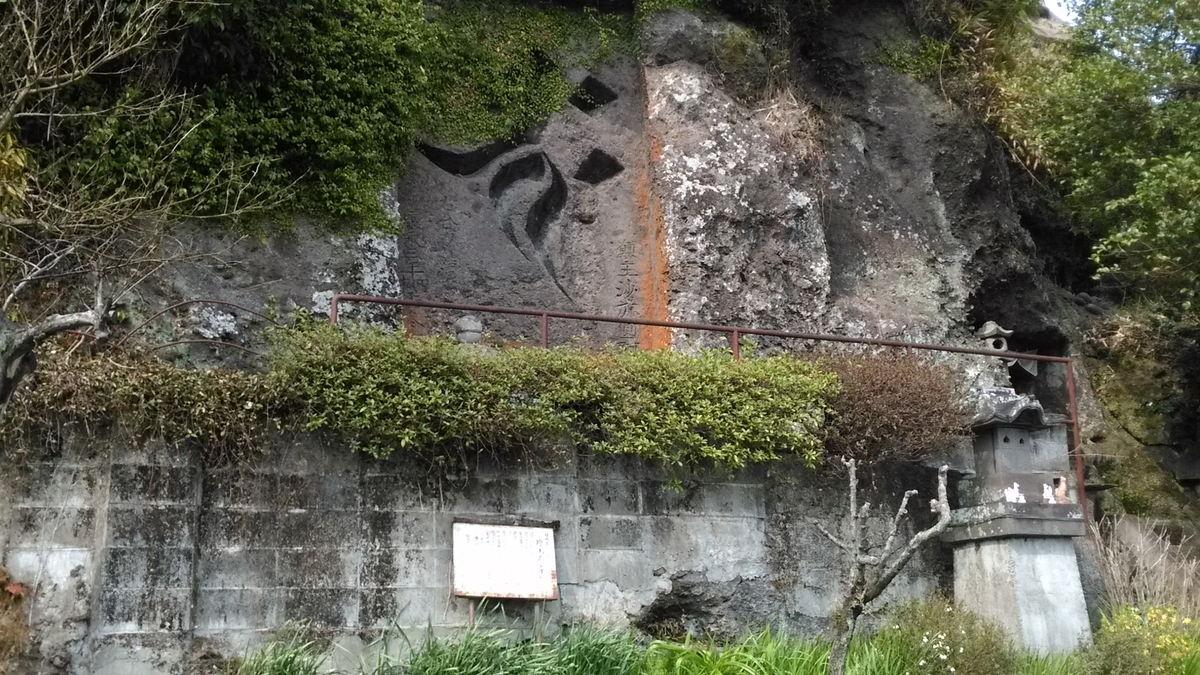岩壁にかなりの大きさの梵字が彫られています。矩形に彫り込んで浅い龕をこしらえ、その中に梵字を彫っていますので対岸からでもよう分かると思います。これほどの規模の磨崖種子は滅多に見られません。道路から数段の階段を経て写真下に写っている案内板の前辺りに上がり、そこから道路に沿うた通路を右方向に行き、石段を上がって左に折り返せば梵字のすぐそばに寄ることができます。右下に写っている石祠はお稲荷さんです。
