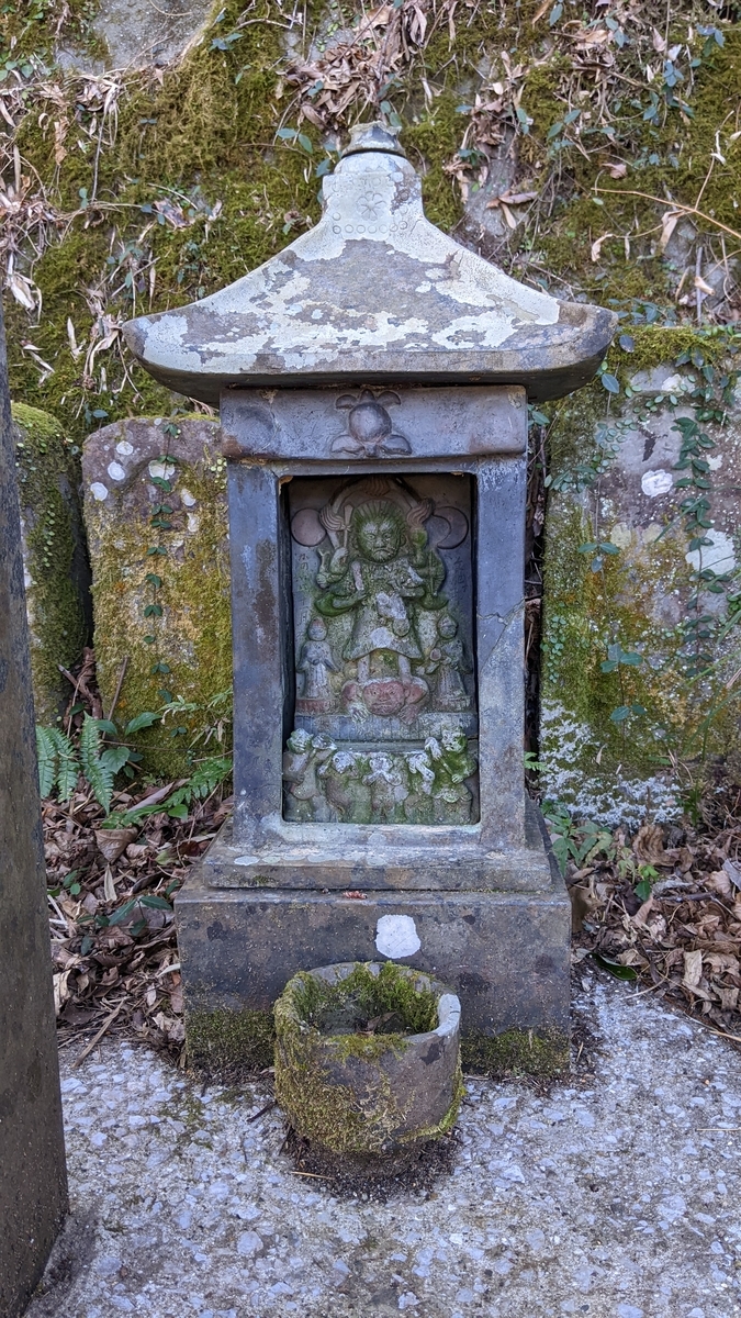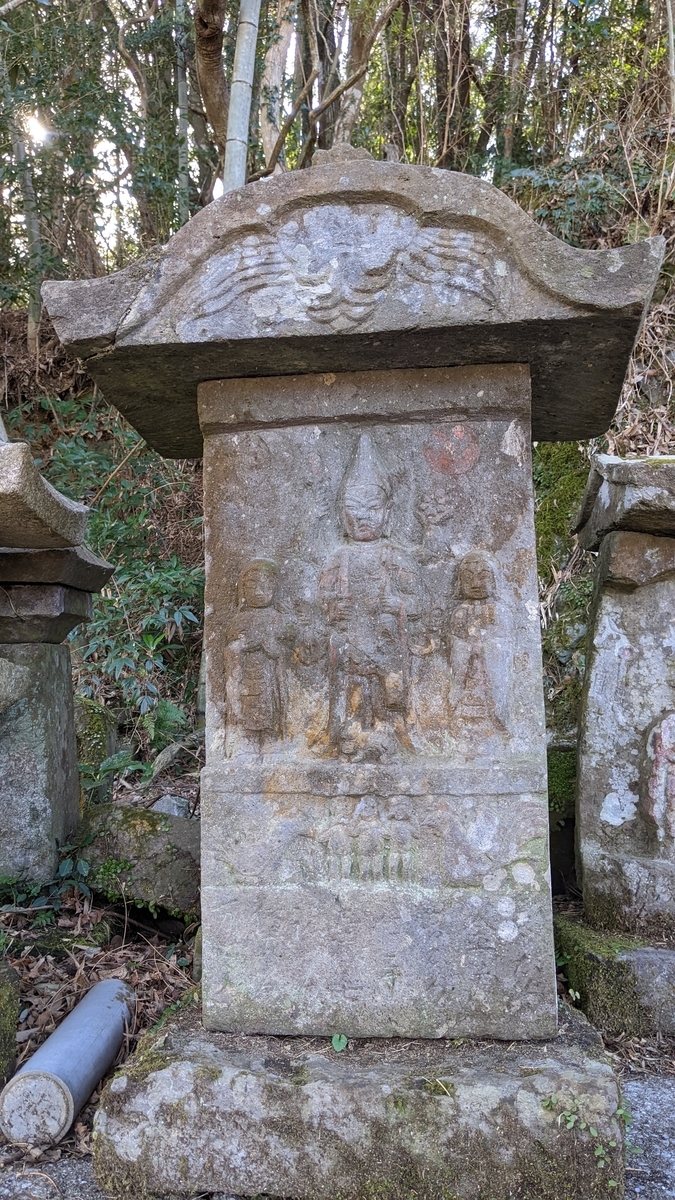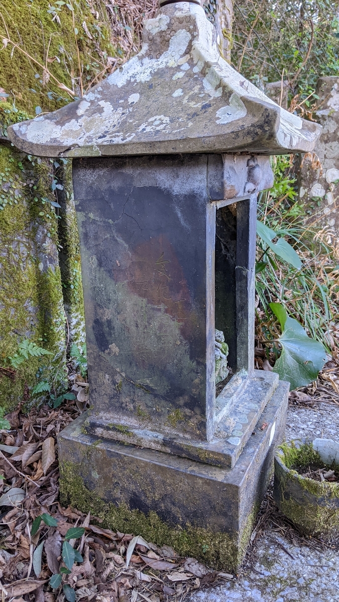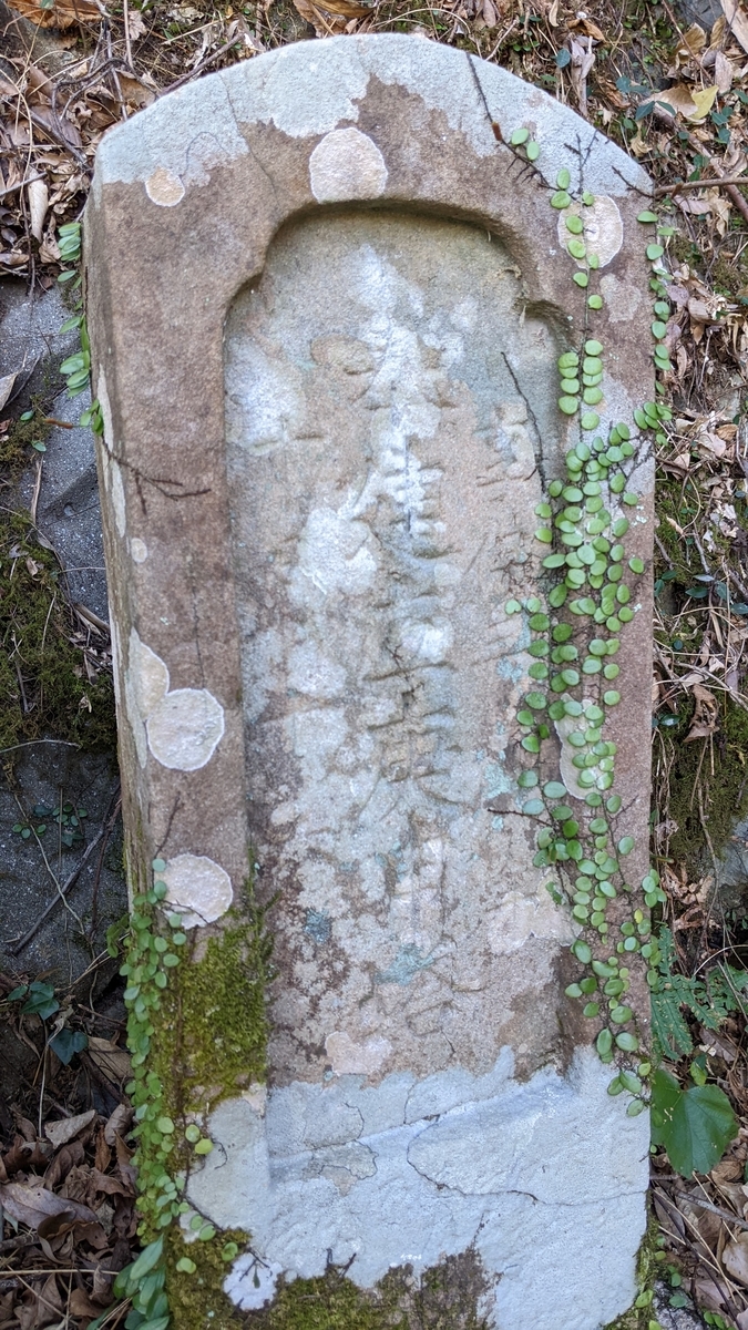 まず、笠に垂木を彫っていません。碑面上部の彫り込み(前後差)は、右側の傷みが著しいものの中央の円弧上の箇所がずいぶん浅いのが見て取れます。日輪にはわっずかに彩色が残るもののほとんどが削れてしまっており、月輪は三日月型がよう分かります。主尊の体型や腕の形は先ほどのものと大同小異です。紀年銘は「天」しか読み取れないものの、日付は「十月十四日」とはっきり読み取れました。下部には8人ないし9人のお名前が彫ってあります。茲の読み取りは難しい状態です。