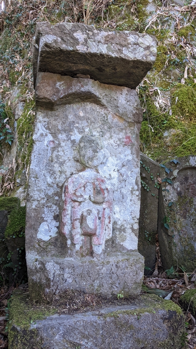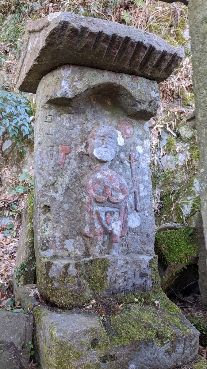 ところで、こちらの庚申塔群は人家からほど近く、しかも瓦製の庚申塔は市の文化財に指定されているにも拘らず場所が分かりづらいので、見学に訪れる方も少ないようです。道の駅やよいから国道10号を佐伯市街方面に行き、番匠交叉点を右折し番匠大橋を渡ります(国道10号を直見方面へ)。切畑小学校入口信号を左折して橋を渡り、踏切を越えた先が須平部落です。右に福祉施設「番匠の杜」を見て、鋭角に左折して下った行き止まりに駐車するとよいでしょう。車を停めたら、番匠の杜の外周の小道を時計回りに進んで、施設の裏に回り込みますと1段高いところに庚申塔が並んでいます(冒頭の写真)。その小路が藪になっていて、イドロが茂りたいへん通りにくいのが難点です。鋏を持って行き適宜切りながら進みませんと、服を傷めてしまうかもしれません。