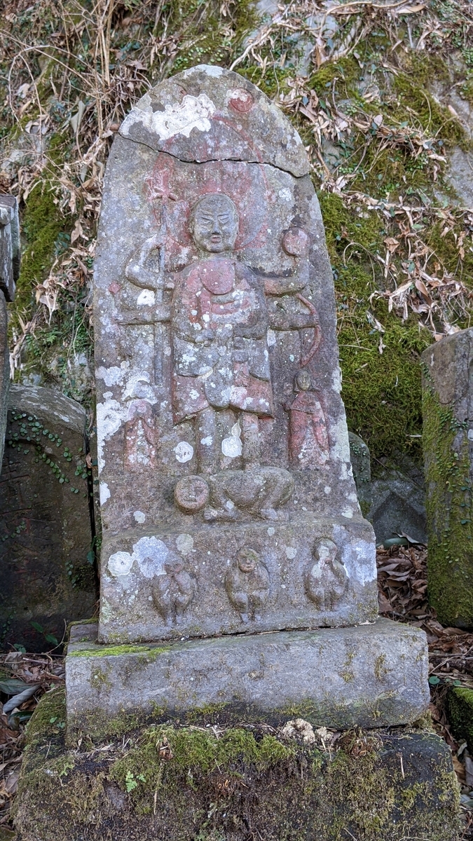 まず日輪・月輪と瑞雲がお花くずしの風情にて、これが舟形の上端近くに配されており、しかもその間に割って入る火焔光背のラインが舟形の外周とよう合うて絶妙な間隔を保っておりますので、配置の妙が感じられました。主尊のお顔は目付きや口許だけ見ますと厳めしい気もしますけれども、そのお耳の形など全体を見ますと仏様のお慈悲の表情にも見えてまいります。炎髪には細かい櫛の目を入れて、これが火焔光背とほぼ相似形をなします。よう見ますと衣紋にも朱を入れて細かい文様を表現していたようですが、体の前面はやや分かりづらくなっています。ショケラも磨滅が進んでいるのが惜しまれます。体前に回した腕はその曲がり方や太さなどごく自然な表現で、とても上手に仕上がっています。それに対して外に伸ばした4本の腕は付け根も長さもちぐはぐで、特に三叉戟を持った腕と弓を持った腕の曲がり方は珍妙を極めます。この箇所が不自然な表現になることには目を瞑って、碑面に対して主尊をことさらに大きく配したところに石工さんの工夫が感じられました。ほっそりとした脚はご愛敬です。