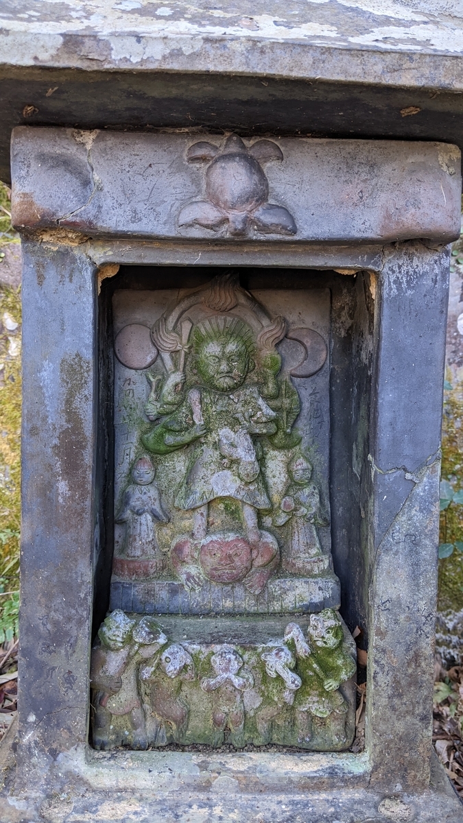 上から見ていきます。火焔輪の上端が矩形の碑面からはみ出していて、3つの焔がみんな形を違えており、丁寧に溝を彫って燃え盛る様子を上手に表現してあります。主尊の炎髪は扇型で、これまた等間隔に溝を彫り、目はどんぐり眼、口はヘの字でよう見ますと顎髭をたくわえています。おどろおどろしい表情に身が竦みます。日輪と月輪には艶感があり、照り輝く様がよう出ています。主尊の腕は複雑に重なり、三叉戟や宝珠なども火焔輪との重なりを厭わで立体的に配されています。逆さづりになったショケラの不気味なること、これも瓦製ならではの緻密な表現です。童子は意地悪そうな表情で、陰で主尊を操っているようなしたたかさが感じられました。めいめいに円形の台座に乗っておりますのもまた、これ見よがしな感じがしておもしろいではありませんか。衣紋のたっぷりとした袂や裳裾のヒダなども丁寧に表現されています。また、主尊や童子の首周りの三角模様、主尊の衣紋の細やかなお花模様なども素晴らしいではありませんか。こんなに不気味な顔なのに花柄の衣紋を纏うとは、意外にお茶目さんです。
