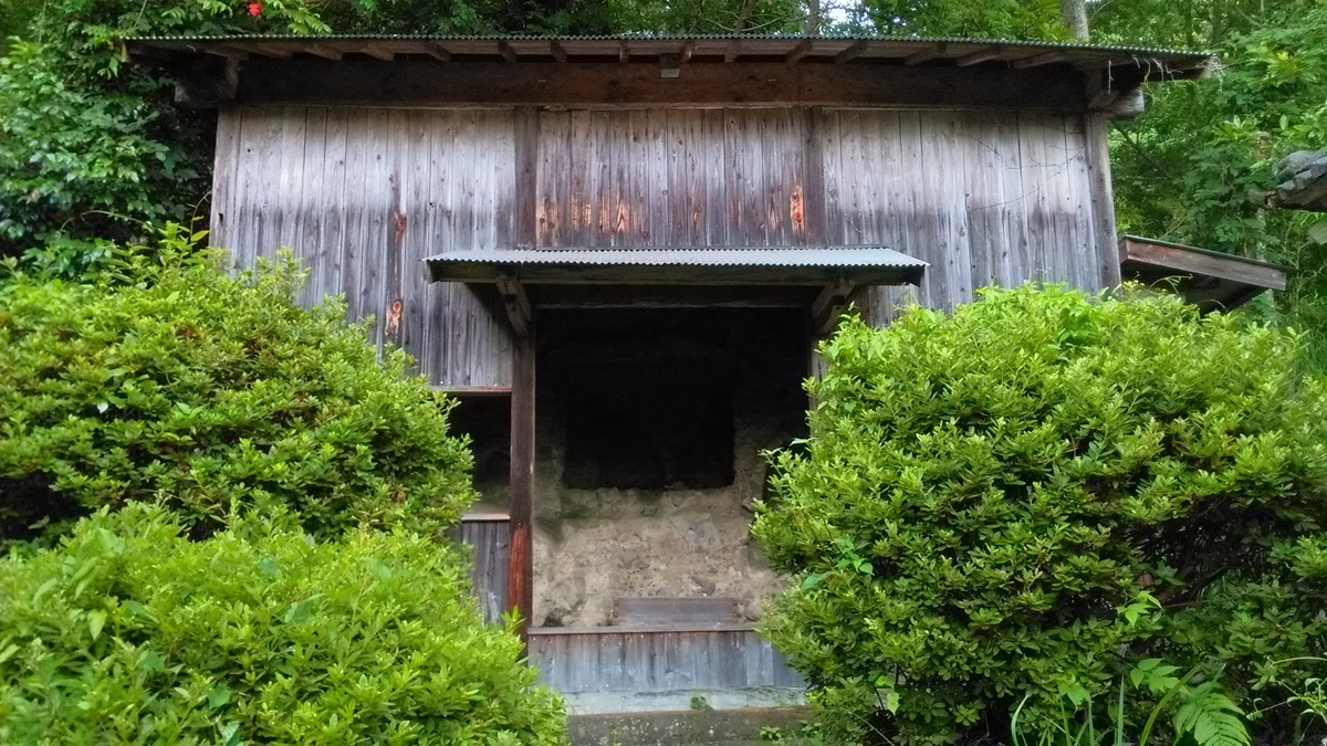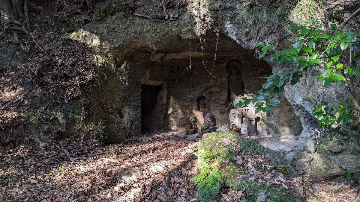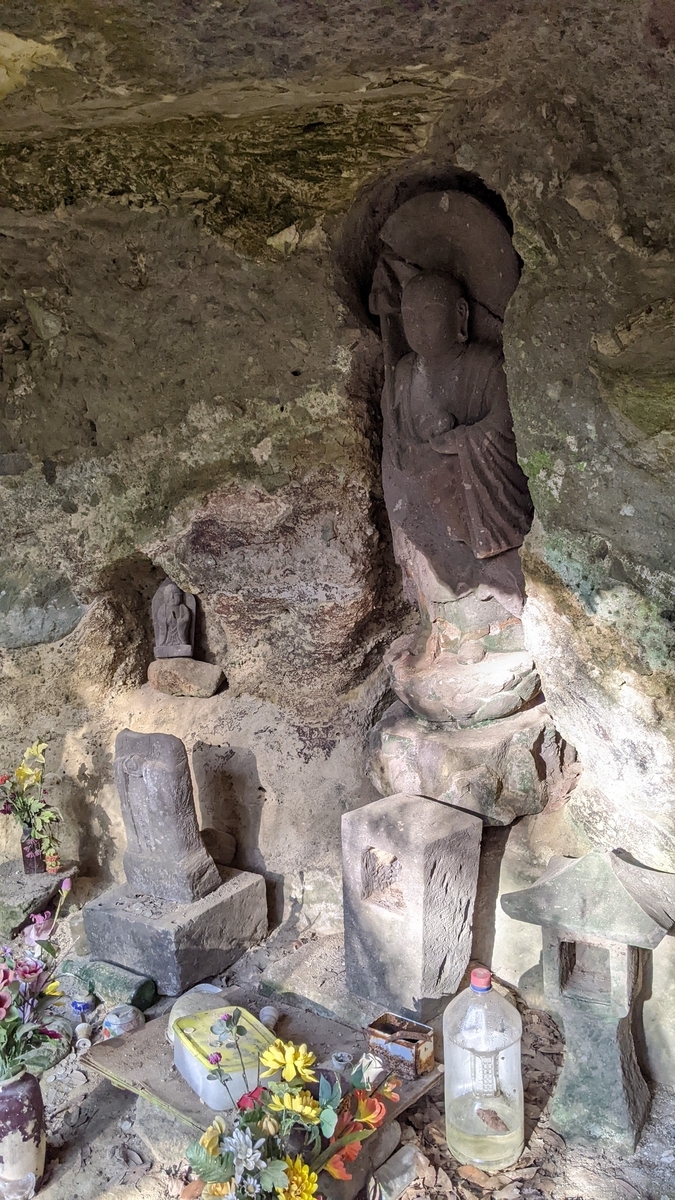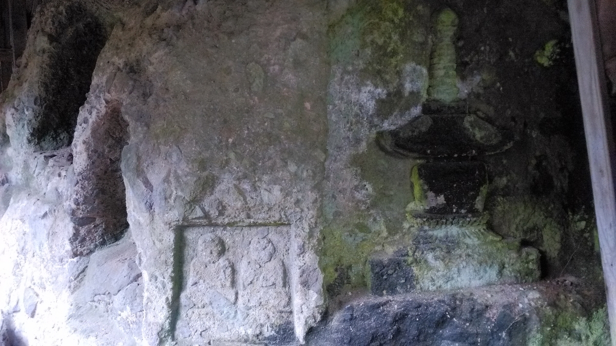 岩屋の手前には平場があり、石垣をついています(1つ上の写真に写っています)。昔は堂様が建っていたそうです。今は堂様こそないものの、岩屋の中にお観音様などをお祀りしています。岩屋はそれなりに間口が広く、開放的な雰囲気です。