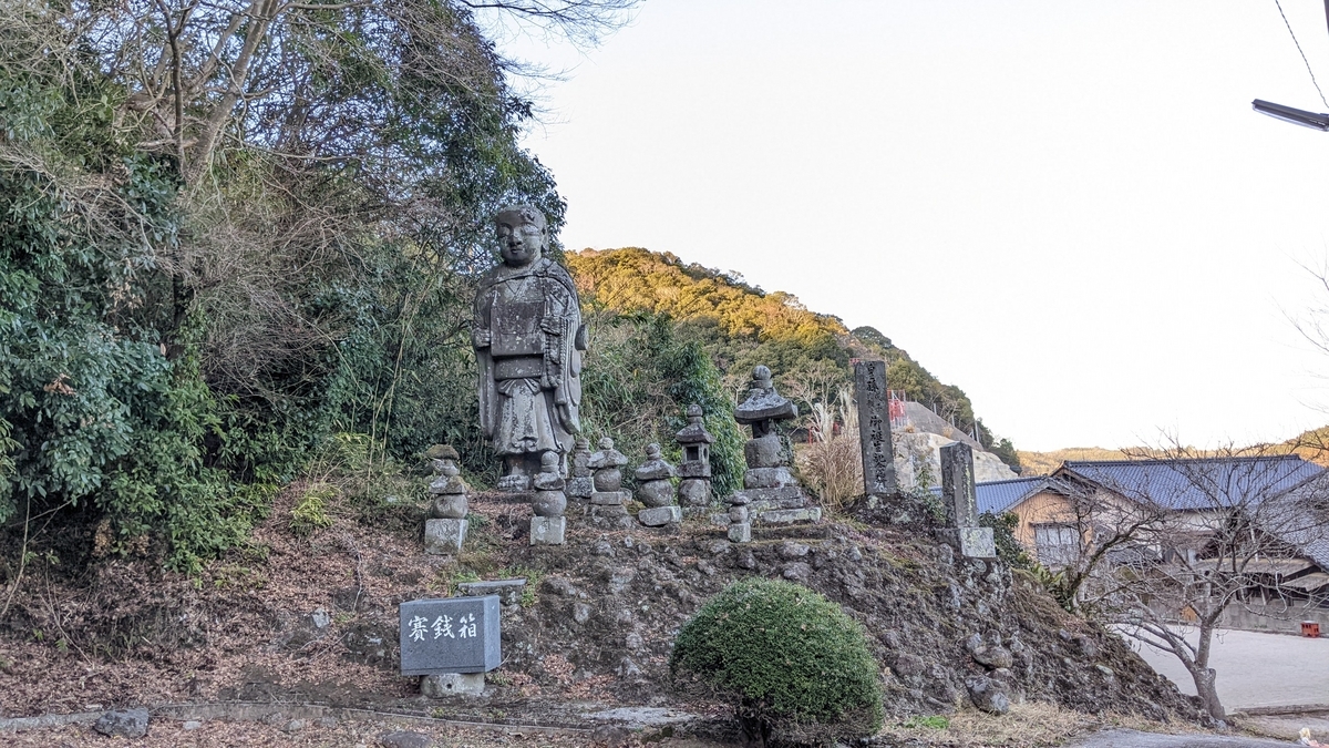 お弘法様の大きな立像は、ずんぐりとした体形です。衣紋の重なりなど丁寧に表現されていますし、お顔の表情もよく、さてもありがたい感じがいたします。お弘法様と申しますと、小型の坐像が道端から屋敷の坪から、国東半島一円にそれはもう数えもやらぬほどお祀りされています。その中で、ときどきこのような大型の立像も見かけます。