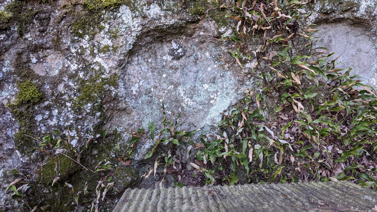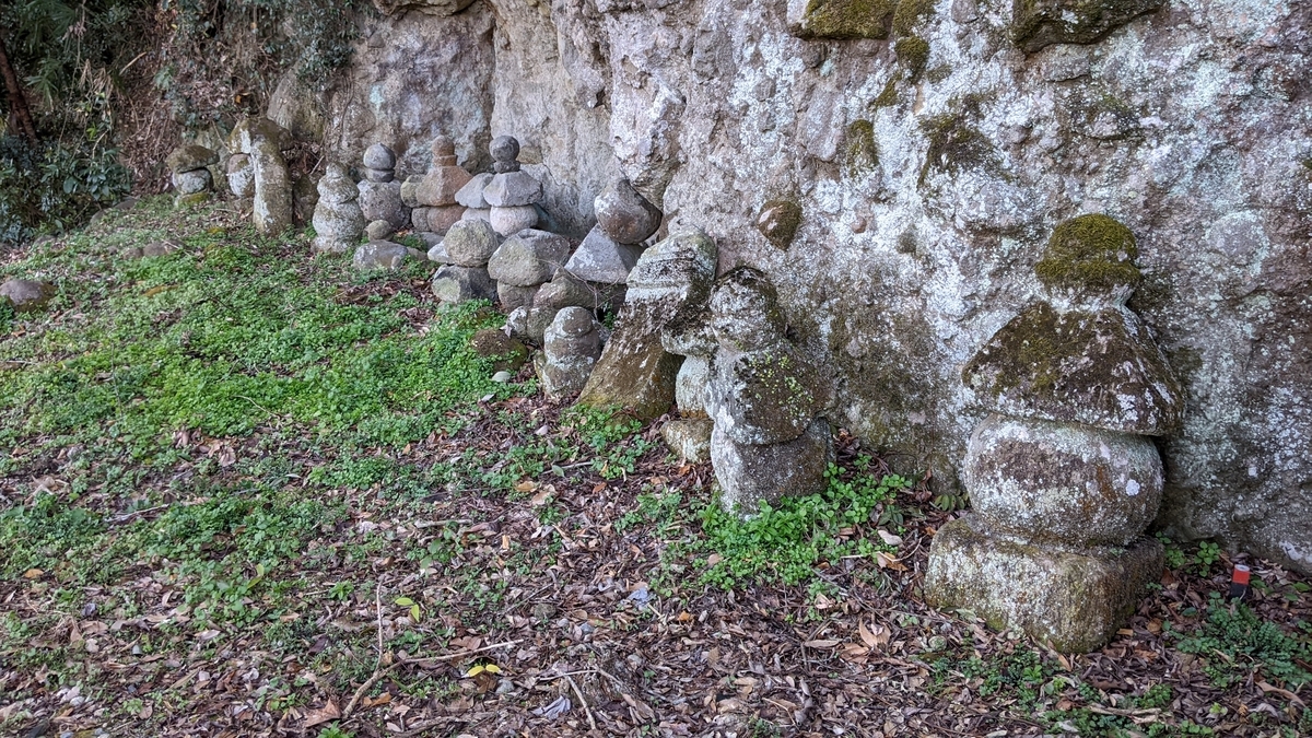 磨崖仏の岩壁の左奥には五輪塔や板碑が多数残っています。傾いたり崩れたりしているものが多い中で、一石造のものは比較的良好な状態を保っていました。