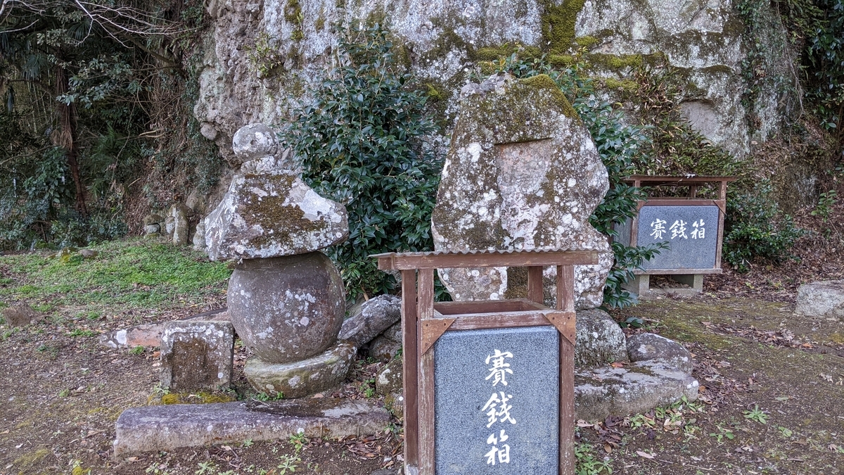 同じ敷地には大岩に刻まれた薬師如来を本尊とする薬師堂があります。正面に本尊の薬師如来坐像と4体の尊名不詳仏がきざまれ、向かって右側の面に磨崖国東塔が刻まれています。