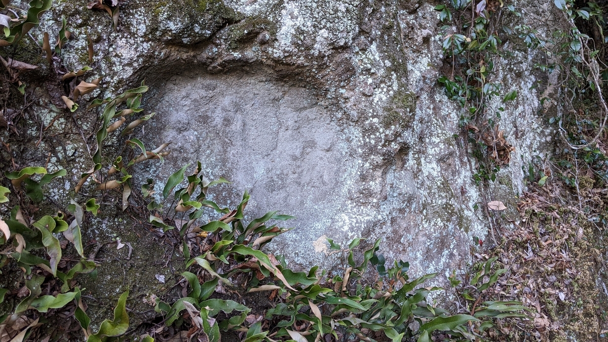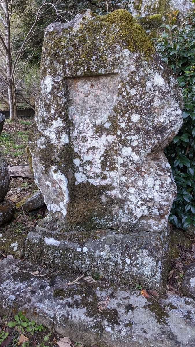 不整形の石板の中央に矩形の枠をこしらえて、その中に銘を彫ってあります。紀年銘もありますが苔で読み取りにくかったので、省きます。このような形状の一字一石塔はあまり見かけません。