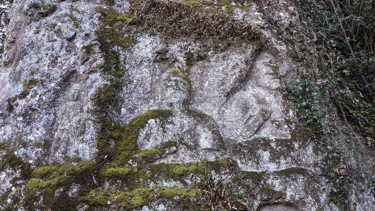 中央の坐像が大日様、向かって右の坐像が薬師様、左の立像は尊名不詳です。大日様と薬師様は、説明板がなければ私には見分けがつかないほどに風化してしまっています。でも、大まかな姿はよう分かります。尊名不詳の像は小型ながらも頭部の状態などは大日様・薬師様よりもよほどよう残っています。この三尊はすぐ目に入りますので、大門坊磨崖仏と申しますとこちらを思い浮かべる方が多いのではないでしょうか。