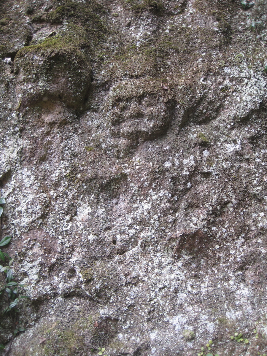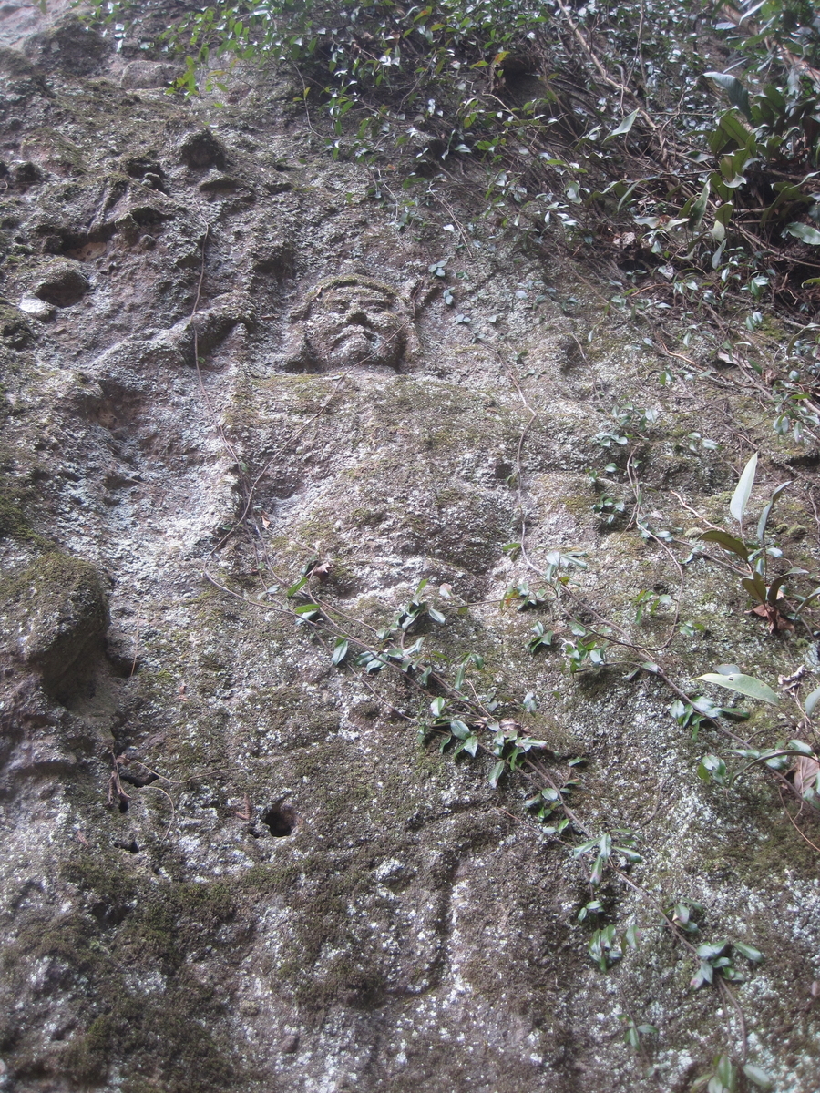 左は役行者でしょうか。右の像は傷みがひどく、よう分かりません。側面から回り込まないと見落とすので、注意深く捜してみてください。いろいろな仏様が彫ってあり、それぞれ特徴が異なります。同時期に彫ったというより、後から後から追刻し今のようになったのではあるまいかと推量いたしました。そうであれば、磨崖国東塔の紀年銘をもって磨崖仏の年代に目安をつけるのは考え物です。でも、個々の仏様がいつの時代のものであろうと、そのありがたさに変わりはありません。