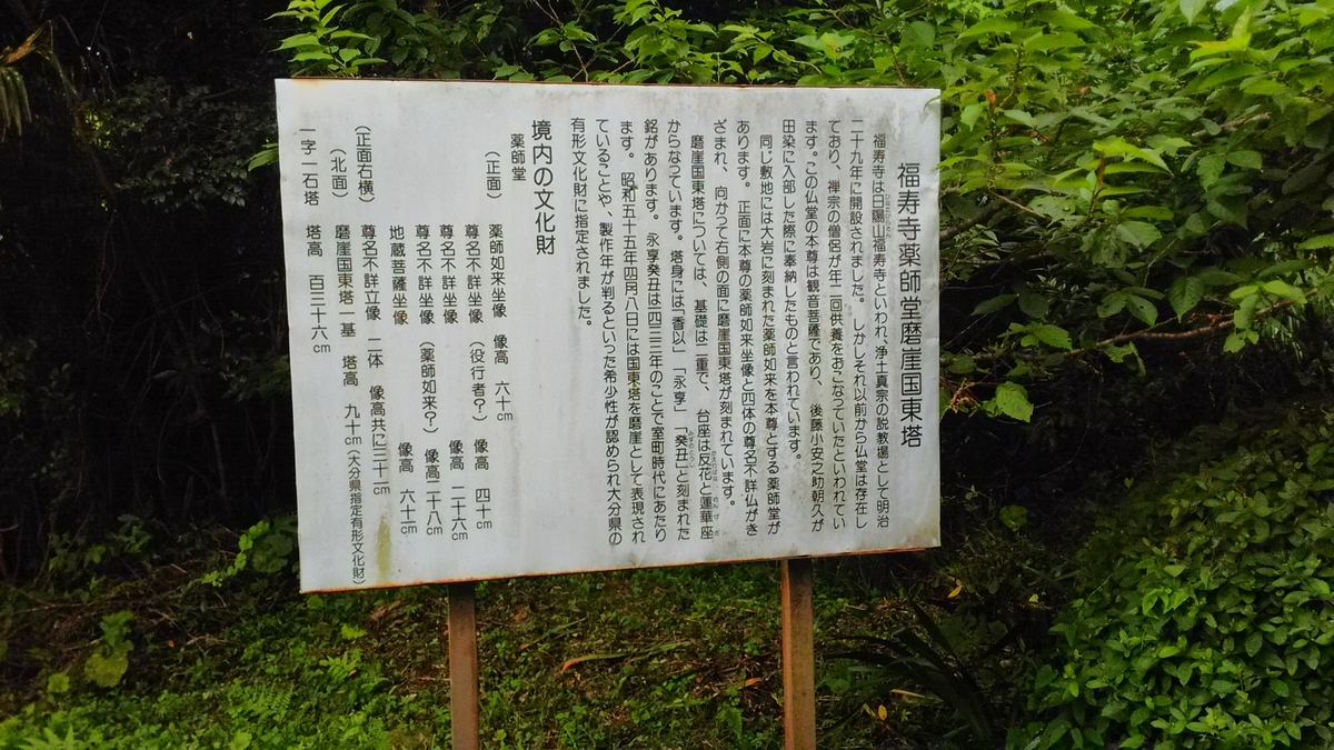 大門坊から真木の大堂を過ぎて、菊山部落の先、平野の分教場跡のところで3方向に道が分かれています。これを右折して立石方面に進みます。薗木方面への分岐(※)を無視してとにかく道なりに行けば陽平部落に至ります。その中ほど、乗り合いタクシー乗り場のところに駐車して、細道を上っていけば福寿寺薬師堂に着きます。歩行距離は知れたものです。