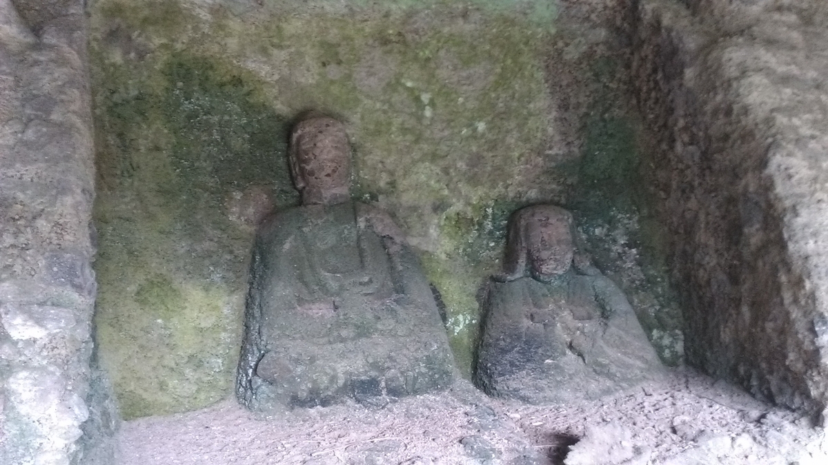 左が薬師様とのことで、正面にあたります。お顔などずいぶん傷みが進んでいます。龕にあっても、岩質等の影響が大きいのでしょうか。隣は比丘尼の様相を呈ていますが詳細は分かりません。