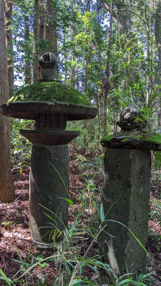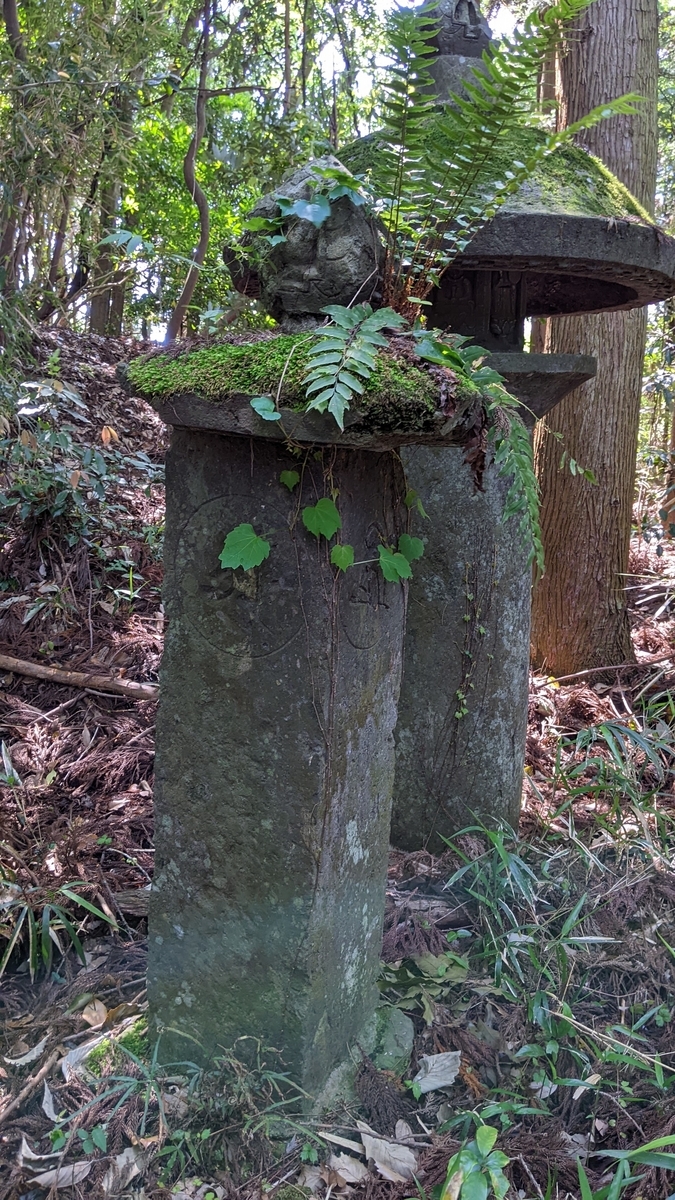2基の石幢のうち片方は県指定の文化財です。ところが行き方がなかなか難しく、周囲が荒れ気味になっています。三重庁舎から牧口方面に進み、「白山渓谷」や「稲積水中鍾乳洞」の標識を目印に左折して県道718号に入ります。左に田んぼを見ながら進み、羽飛部落(大字秋葉のうち)を過ぎますと緩やかな上り坂にかかります。右カーブして、電信柱のところから左に分かれる簡易舗装の道に入ります。この道は軽自動車でもぎりぎりの幅しかなく、転回もできませんから車では入らない方がよいでしょう。当日、間違って車で入って奥まで行ってしまい、後退に難渋しました。