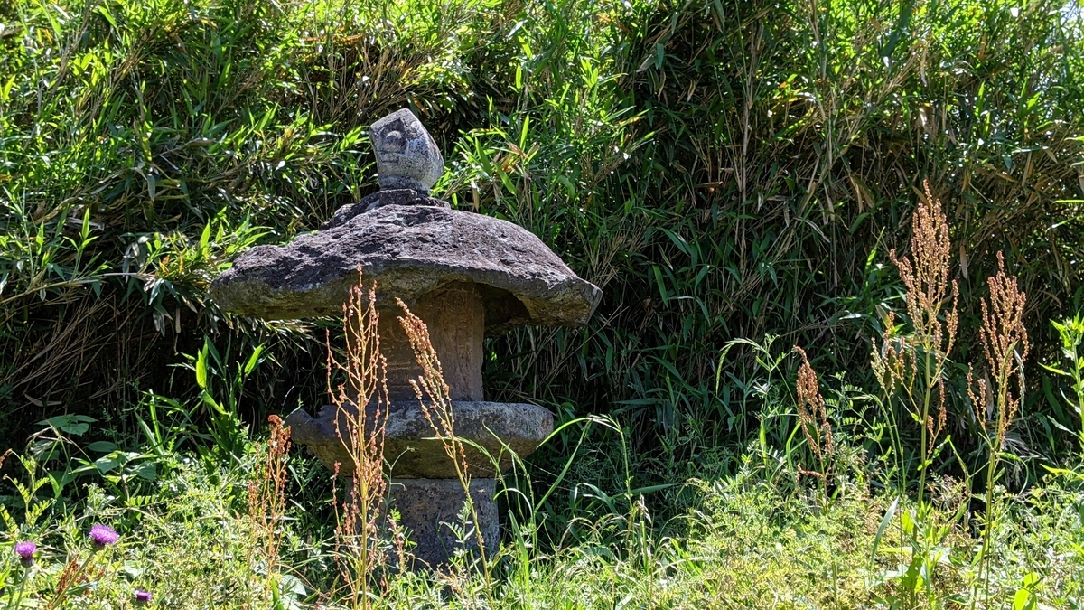 細道に入ってほどなく、左側の道路端に文化財の標柱が立てかけてあります。これを見落とさないようにします(お墓のところの分岐よりも手前です)。標柱のところから段差をよじ登りますと、右上には古いめいめい墓があります。そのお墓の方には行かずに、概ね平坦に奥へと進んでいきますと石幢が見えてきます。地蔵院がいつ頃廃されたのか定かではありませんけれども、礎石など建物の痕跡は見当たりませんでした。藪に埋もれているのかもしれません。
