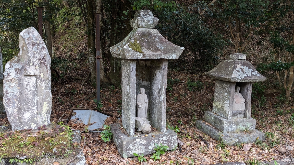 中央は、中のお地蔵様に対して御室が大きすぎます。本来は別の何かがおさまっていたのかもしれません。お地蔵様は優しそうなお顔立ちで、優美な立ち姿が心に残りました。その手前には石塔の残部(宝珠)が安置されています。また、この御室の屋根の突端を見ますと、宝篋印塔の笠になっています。これも後家合わせで、粗末にならないように残部を組み合わせたのでしょう。