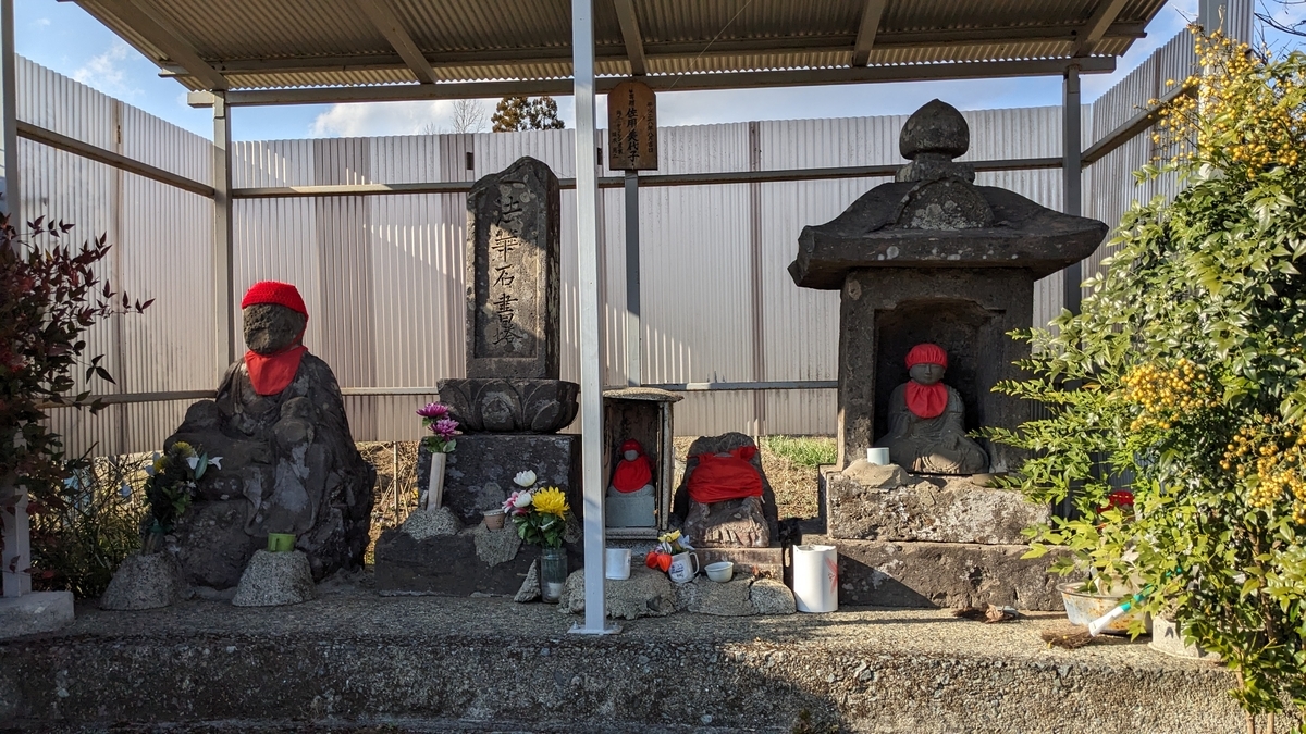 こちらは公民館の並び、道路端の一角です。中央の石塔の銘は「法華石書塔」で、これは「大乗妙典一字一石塔」と同じ意味です。その両側には大小さまざまの仏様(おそらくお地蔵様)が丁重にお祀りされています。波板の囲いと屋根は佐用美代子さんの寄進によるものです。
