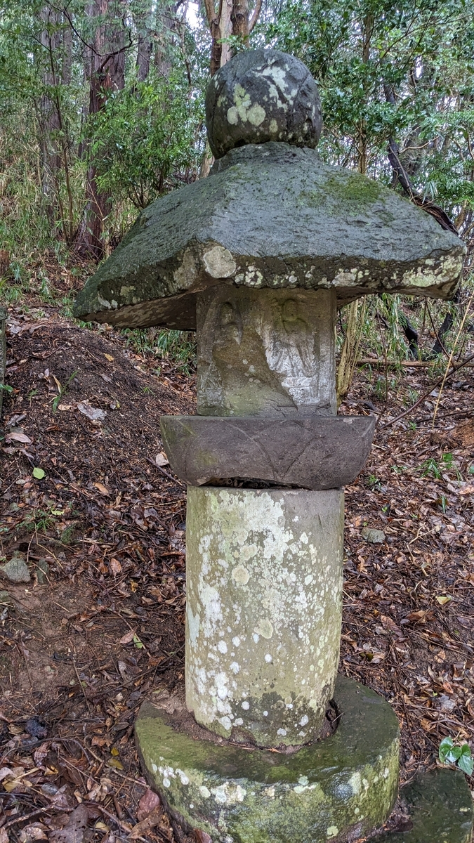 このように、石幢は道路より高い位置にあります、下から見上げますと、より一層立派に見えてまいります。ご丁寧に道路から石幢まで簡易的な石段をこしらえてくださっているのですが、土や落ち葉等の堆積でやや滑りやすくなっています。近くで見学したい場合、転ばないように気を付けてください。